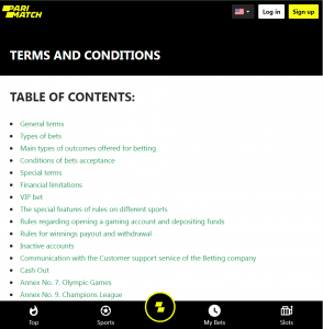 Son olarak, bahis şirketinin cazibe merkezlerine gitmeden önce, onları yöneten şartlar ve koşullar (https://global.parimatch.com/en/terms-and-conditions#id10) hakkında bilgi edinmek akıllıca olacaktır.